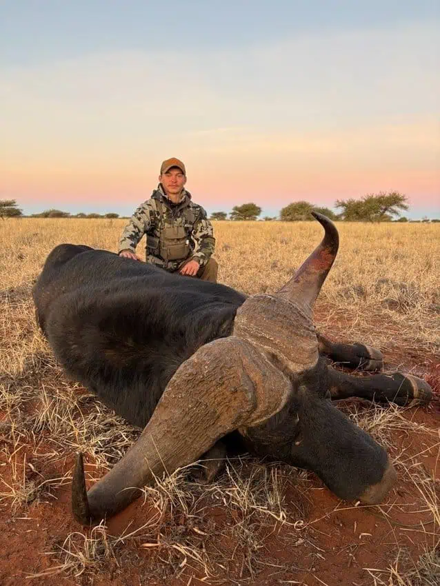 Jägaren Arvid Dalfjärd poserar bredvid en stor buffel på den afrikanska savannen, iklädd jaktkläder under solnedgång. Bilden symboliserar föreläsningens tema under jägarkvällen på Mellomgården den 21 februari.